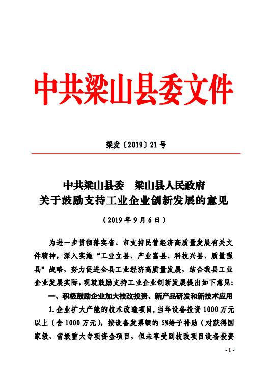 中共梁山縣委梁山縣人民政府關(guān)于鼓勵支持工業(yè)企業(yè)創(chuàng)新發(fā)展的意見