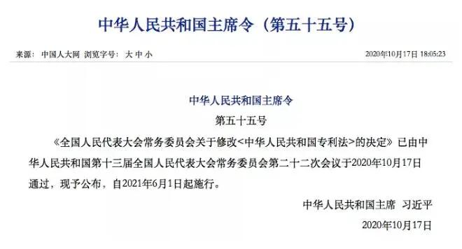2020年10月17日,第十三屆全國人民代表大會常務(wù)委員會第二十二次會議通過了關(guān)于修改《中華人民共和國專利法》的決定,外觀設(shè)計專利保護期限從10年延長至15年,自2021年6月1日起施行。