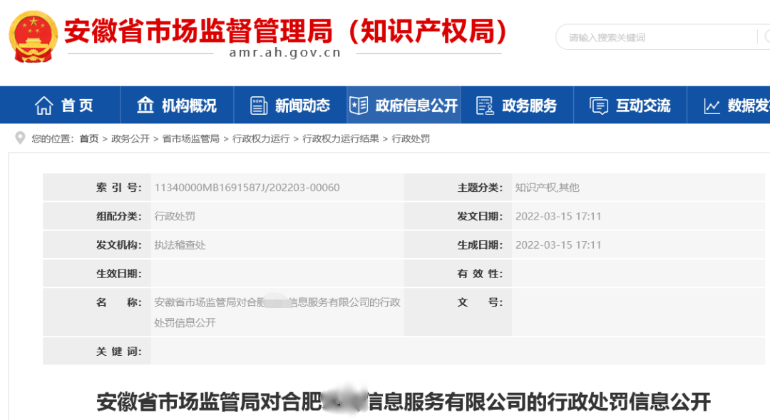 安徽省市場(chǎng)監(jiān)管局對(duì)合肥XX信息服務(wù)有限公司的行政處罰信息公開