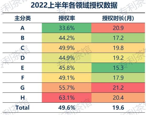 上半年基本結(jié)束,上半年的數(shù)據(jù)也基本塵埃落地。對(duì)上半年已公開(kāi)(截止到6.20)的發(fā)明專(zhuān)利授權(quán)量進(jìn)行統(tǒng)計(jì)分析,其中,發(fā)明授權(quán)量36.7萬(wàn)件、駁回19.7萬(wàn)件、撤回17.5萬(wàn)件,結(jié)案總量73.9萬(wàn)件。基于上述數(shù)據(jù)分別統(tǒng)計(jì)計(jì)算主分類(lèi)為A-H部的發(fā)明專(zhuān)利授權(quán)時(shí)長(zhǎng)(從實(shí)質(zhì)審查生效日到授權(quán)日)、發(fā)明專(zhuān)利授權(quán)率(授權(quán)率/結(jié)案量),結(jié)果如下: