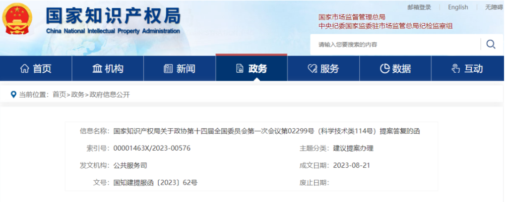 國家知識(shí)產(chǎn)權(quán)局關(guān)于政協(xié)第十四屆全國委員會(huì)第一次會(huì)議第02299號(hào)(科學(xué)技術(shù)類114號(hào))提案答復(fù)的函