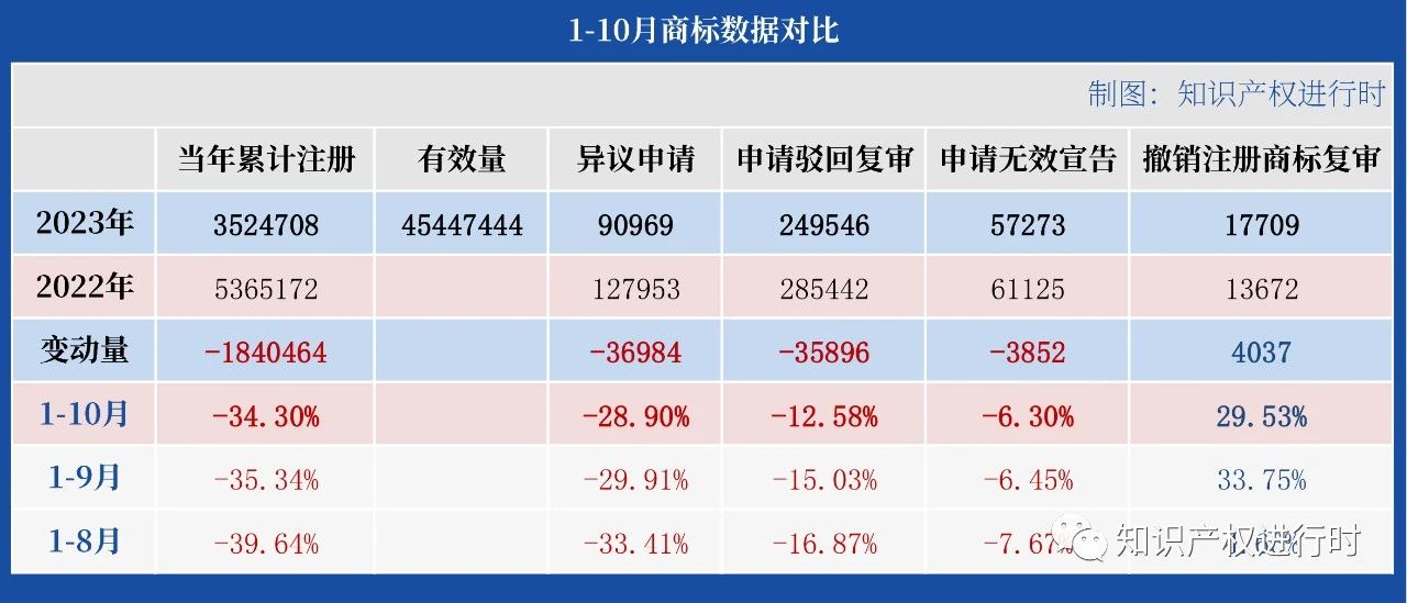 2023年1-10月商標(biāo)注冊量相比2022年商標(biāo)注冊量減少184.05萬件(同比下降34.30%)。