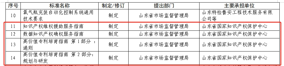 近日,省市場監(jiān)督管理局發(fā)布《關(guān)于<居民基本養(yǎng)老保險辦理服務(wù)規(guī)范>等第三批地方標(biāo)準(zhǔn)計劃項目的公示》,山東省國家知識產(chǎn)權(quán)保護(hù)中心(以下簡稱山東保護(hù)中心)牽頭申報的《知識產(chǎn)權(quán)維權(quán)援助服務(wù)指南》《數(shù)據(jù)知識產(chǎn)權(quán)確權(quán)服務(wù)指南》《高價值專利培育指南 第1部分 :通則》和《高價值專利培育指南 第2部分:規(guī)劃與研發(fā)》4項省級地方標(biāo)準(zhǔn)獲批立項。