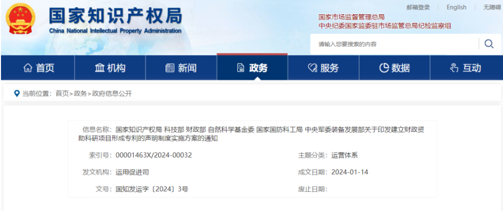 2021年,黨中央、國(guó)務(wù)院印發(fā)《知識(shí)產(chǎn)權(quán)強(qiáng)國(guó)建設(shè)綱要(2021—2035年)》,明確提出“建立完善財(cái)政資助科研項(xiàng)目形成知識(shí)產(chǎn)權(quán)的聲明制度(以下簡(jiǎn)稱(chēng)聲明制度)”。《“十四五”國(guó)家知識(shí)產(chǎn)權(quán)保護(hù)和運(yùn)用規(guī)劃》也對(duì)“建立健全財(cái)政資助科研項(xiàng)目形成知識(shí)產(chǎn)權(quán)的聲明制度和監(jiān)管機(jī)制”作出部署。2023年10月,國(guó)務(wù)院辦公廳印發(fā)《專(zhuān)利轉(zhuǎn)化運(yùn)用專(zhuān)項(xiàng)行動(dòng)方案(2023—2025年)》,進(jìn)一步明確“啟動(dòng)實(shí)施財(cái)政資助科研項(xiàng)目形成專(zhuān)利的聲明制度”的要求。