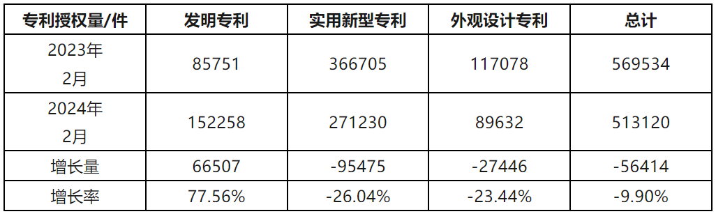 2024年2月我國實(shí)用新型專利同比下降26.04%,發(fā)明專利授權(quán)量同比增長77.56%