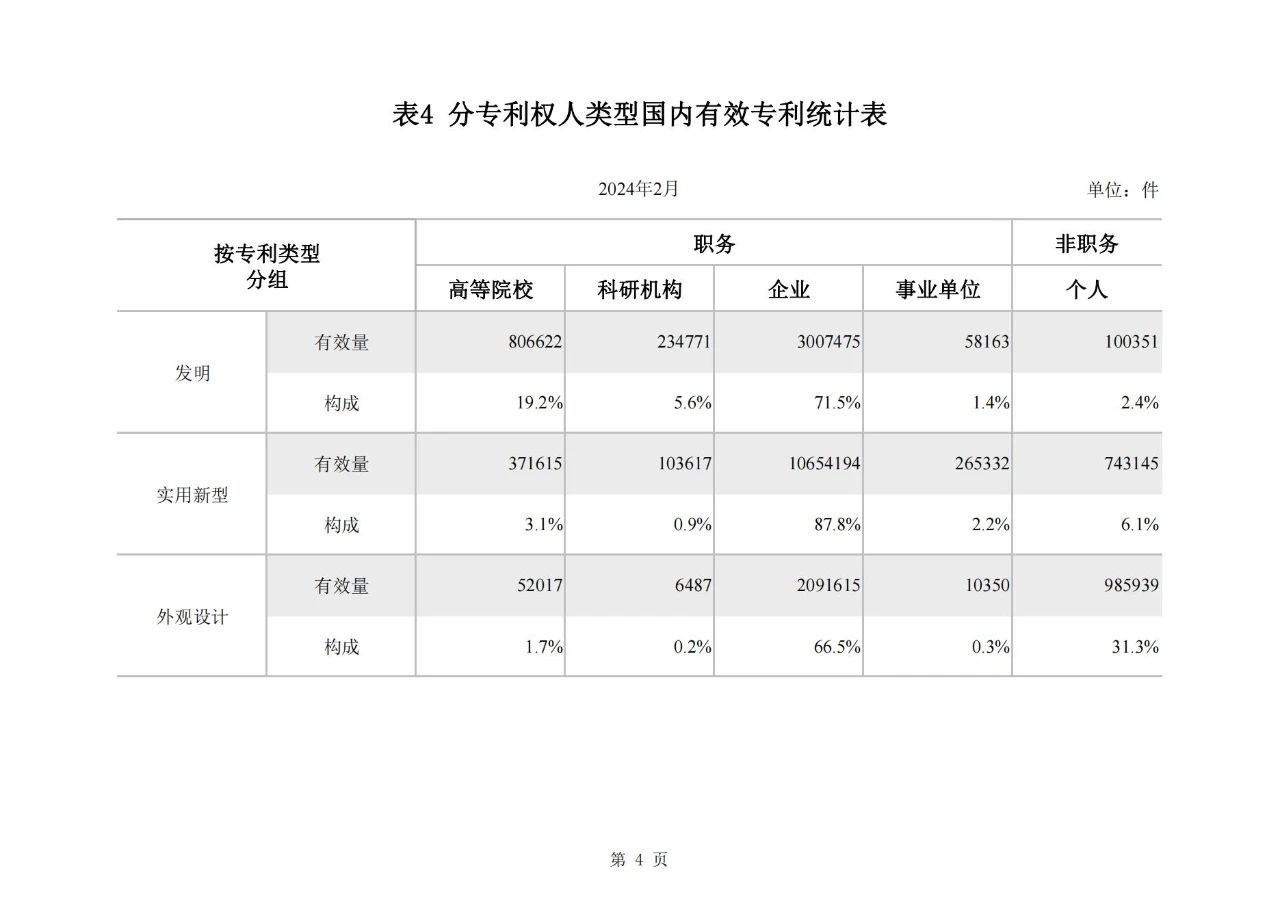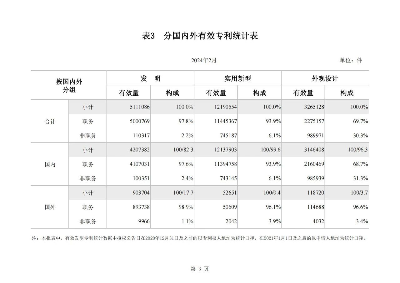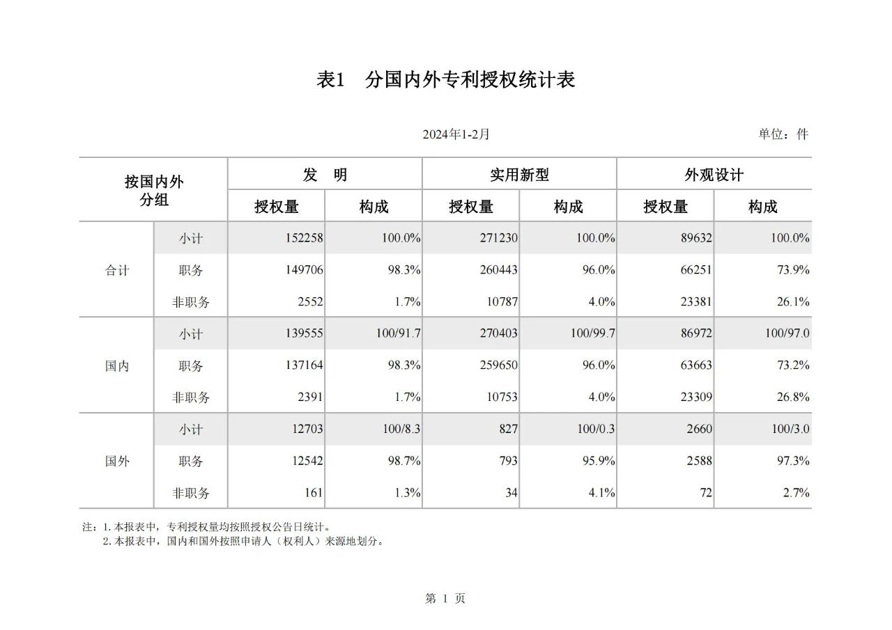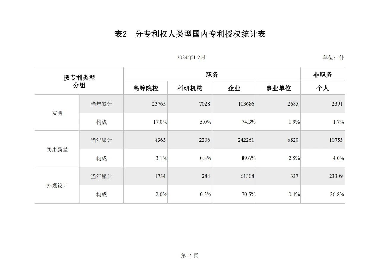 近日,國家知識產(chǎn)權(quán)局發(fā)布了2024年2月國家知識產(chǎn)權(quán)局審查注冊登記統(tǒng)計月報。相較于2023年2月,發(fā)明專利授權(quán)量同比增長77.56%,實(shí)用新型同比下降26.04%,外觀設(shè)計同比下降23.44%。