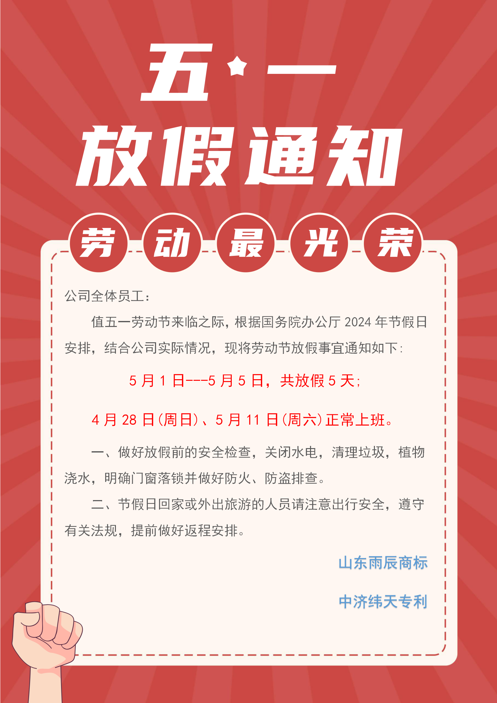 值五一勞動節(jié)來臨之際,根據國務院辦公廳2024年節(jié)假日安排,結合公司實際情況,現將勞動節(jié)放假事宜通知如下: