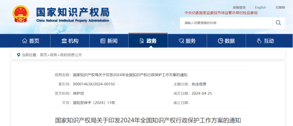 國家知識產(chǎn)權(quán)局關(guān)于印發(fā)2024年全國知識產(chǎn)權(quán)行政保護(hù)工作方案的通知