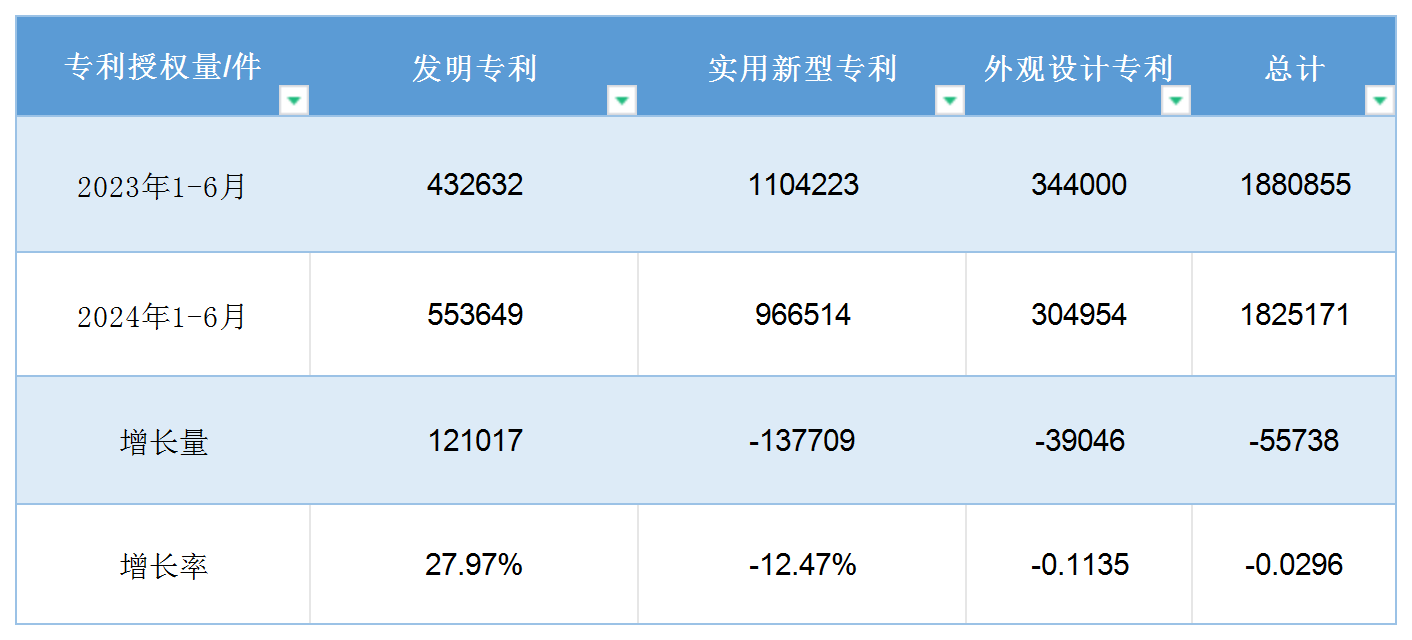 2024年1-6月我國實用新型同比下降12.47%,發(fā)明專利授權(quán)量同比增長27.97%