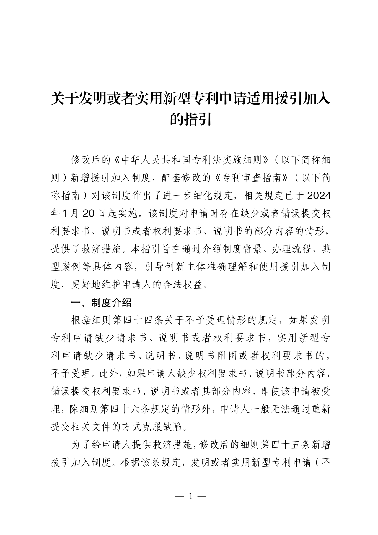 為深入貫徹落實《“十四五”國家知識產權保護和運用規(guī)劃》任務部署,完善知識產權法律政策體系,及時推動修改后專利法實施細則和專利審查指南施行工作,引導創(chuàng)新主體準確理解和使用援引加入制度,幫助申請人提升專利申請相關手續(xù)的辦理質量,推動專利事業(yè)高質量發(fā)展,國家知識產權局組織編寫了《關于發(fā)明或者實用新型專利申請適用援引加入的指引》,供相關創(chuàng)新主體參考使用。