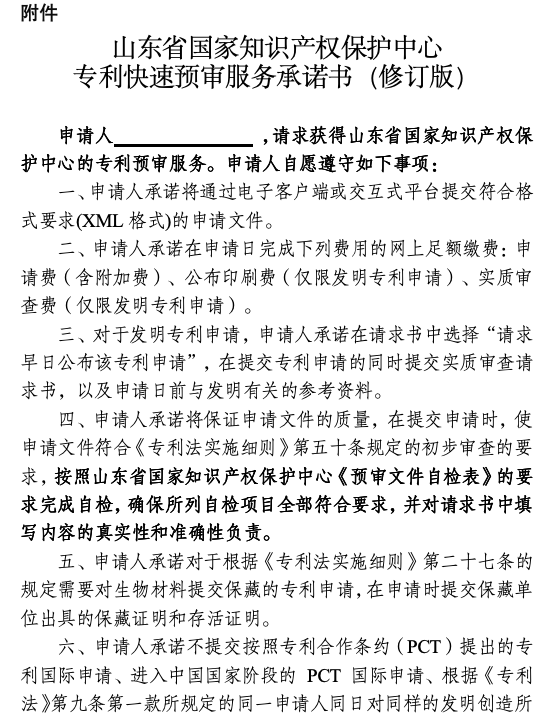 附件:山東省國家知識產(chǎn)權(quán)保護(hù)中心專利快速預(yù)審服務(wù)承諾書(修訂版)