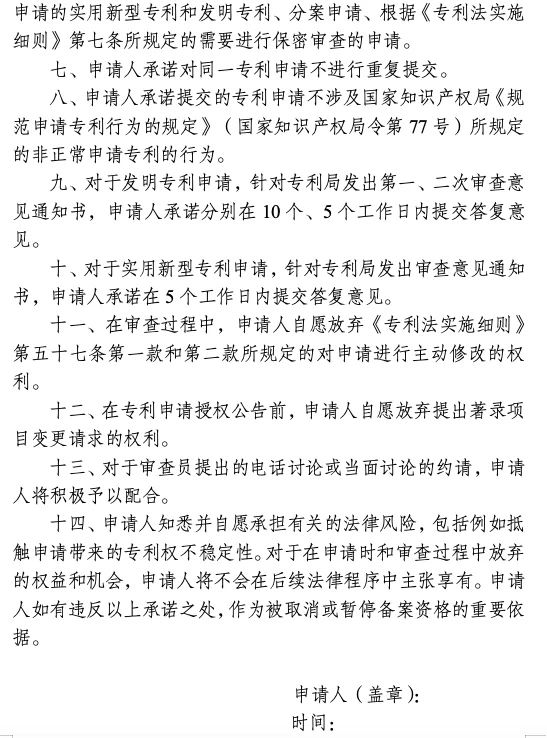 二是精簡預(yù)審申請材料。實施專利預(yù)審告知承諾制,《承諾書》(見附件)可缺省發(fā)明名稱、多次使用,有效期自蓋章之日起至當(dāng)年年底;《專利申請須知》、專利申請PDF格式文件、第一發(fā)明人身份證復(fù)印件、《預(yù)審文件自檢表》及總委托書證明材料等可免于提交,由申請主體承諾自行做好相關(guān)信息核查。