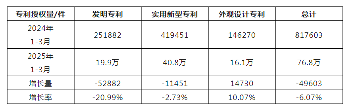 三連降!2025年1-3月我國(guó)發(fā)明專利授權(quán)量同比下降20.99%,實(shí)用新型同比下降2.73%