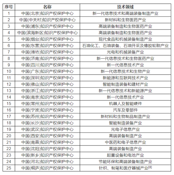 2019年11月25日,中國國家知識產(chǎn)權(quán)局在北京舉行新聞發(fā)布會透露,目前已在全國建立25家知識產(chǎn)權(quán)保護(hù)中心,以促進(jìn)和加強(qiáng)知識產(chǎn)權(quán)快保護(hù)工作。筆者將這些知識產(chǎn)權(quán)保護(hù)中心的名稱和主要負(fù)責(zé)的技術(shù)領(lǐng)域總結(jié)在下表中: