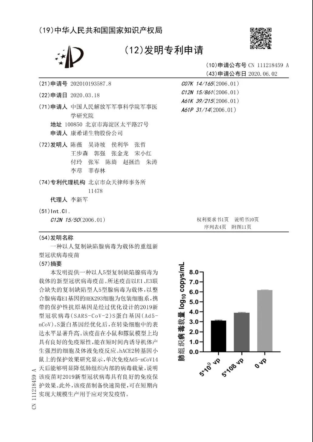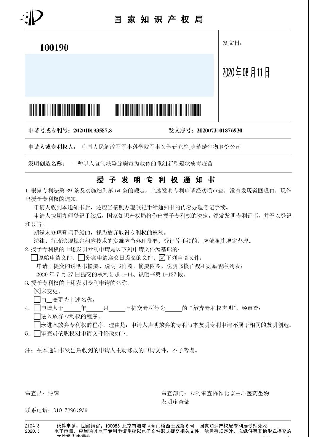 據(jù)國家知識產(chǎn)權(quán)局介紹,經(jīng)核,該疫苗專利申請發(fā)明名稱為“一種以人復制缺陷腺病毒為載體的重組新型冠狀病毒疫苗”,該專利申請?zhí)枮?02010193587.8,申請人為中國人民解放軍軍事科學院軍事醫(yī)學研究院和康希諾生物股份公司,發(fā)明人為陳薇等,申請日為2020年3月18日,經(jīng)提交優(yōu)先審查請求后,國家知識產(chǎn)權(quán)局于2020年8月11日發(fā)出專利授權(quán)通知書,待申請人依法辦理專利權(quán)登記手續(xù)后,該局將公告授權(quán)該專利。